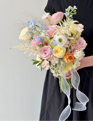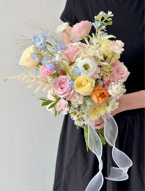 Fresh Flower: 1 x Orange tulips , 2 x Astilbe, 1 x White tulips, 2 x Delphinium Blue, Hana White, Ammi Majus , Yellow Carnation , Pink Carnation, Apricot Blush Pink Eustoma, Pink Rose, White Rose, Buttercup Rose, White Eustoma, Oxypetalum Blue, Trachymene White , Carnation Spray, Matthiola Champagne, Panicum, Orange Rose Spray