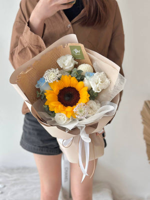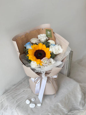 Sunflower, White Rose, Ping Pong, Eustoma, Trachymene, Eucalyptus