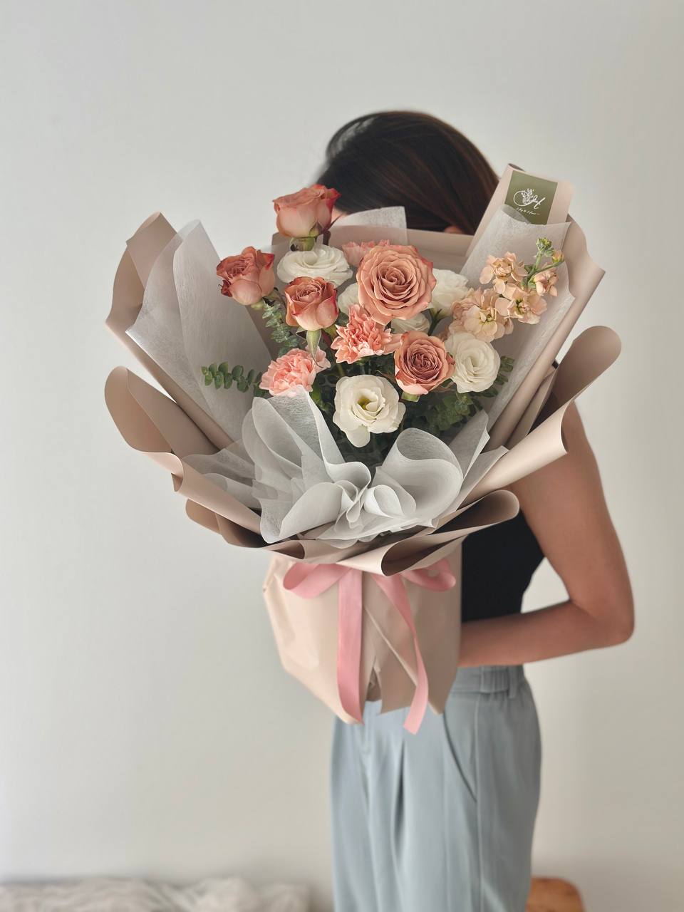 Imported Cappuccino Rose, Carnation, Eustoma, Matthiola, Eucalyptus