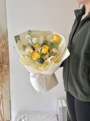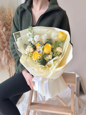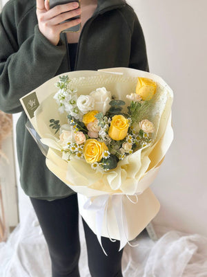 Yellow Rose, White Rose, Eustoma, Matthiola, Chamomile, Carnation, Eucalyptus