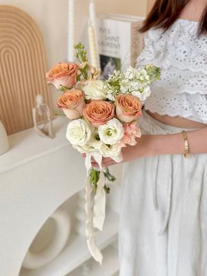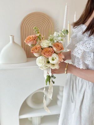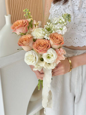 Fresh Flower: 4 x Cappuccino Rose, 2 x Matthiola, Panicum, Eustoma, Carnation