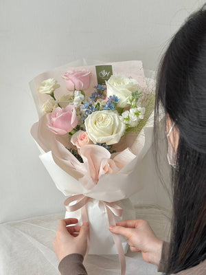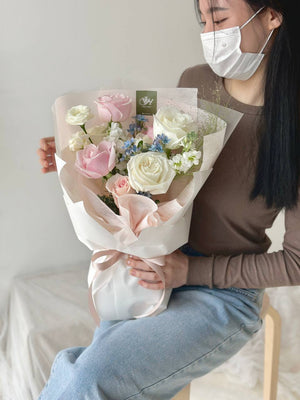 Fresh Flower: White Rose, Pink Rose, Eustoma, Panicum, Matthiola, Oxypetalum Blue, Eucalyptus