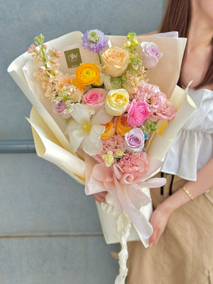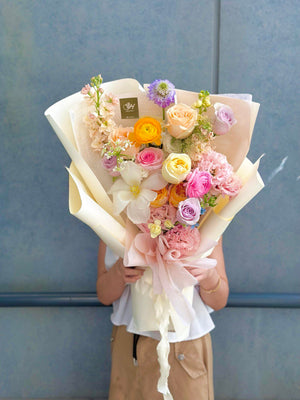 Place your flower bouquet in a cool room or shaded area. Please avoid placing your bouquet in a fridge / exposing your bouquet to direct extreme heat, ripening fruits, and direct sunlight.