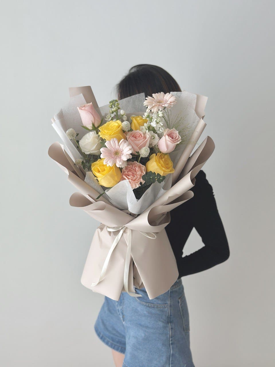 Gerbera, Yellow Rose, Matthiola, Eustoma, Carnation, Eucalyptus