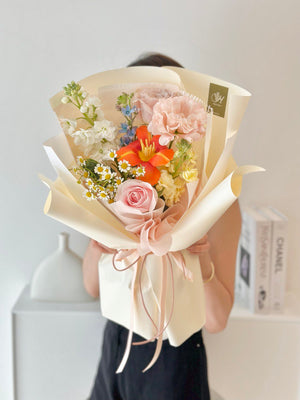 Fresh Flower: 1 x Orange Tulip, Pink Rose, Quicksand Rose, Matthiola, Oxypetalum Blue, Eustoma, Chamomile