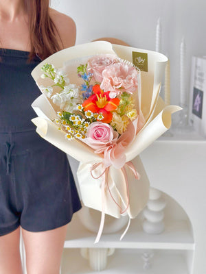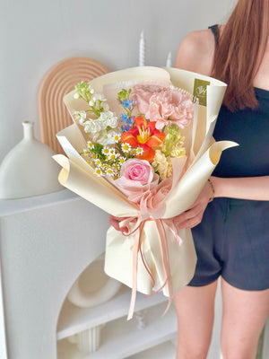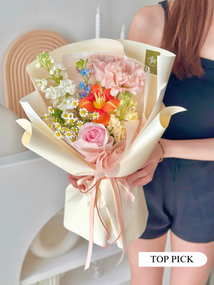 Place your flower bouquet in a cool room or shaded area. Please avoid placing your bouquet in a fridge / exposing your bouquet to direct extreme heat, ripening fruits, and direct sunlight.
