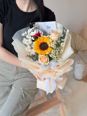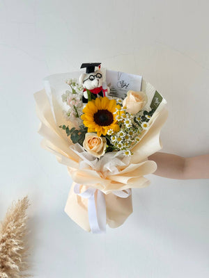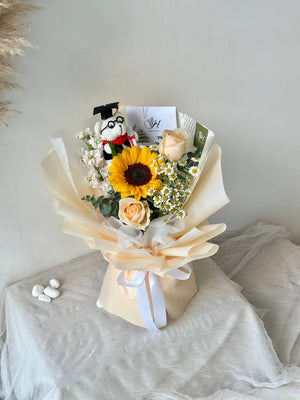 Sunflower, Campaign Rose, Matthiola, Chamomile, Graduation Bear, Eucalyptus