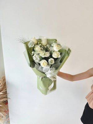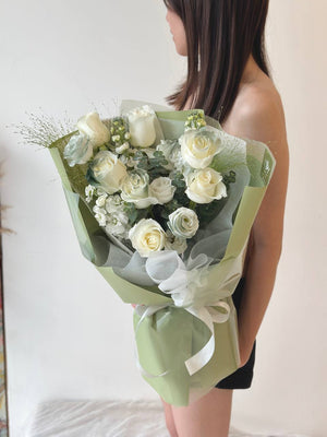 White Rose, Eustoma, Matthiola, Panicum, Eucalyptus