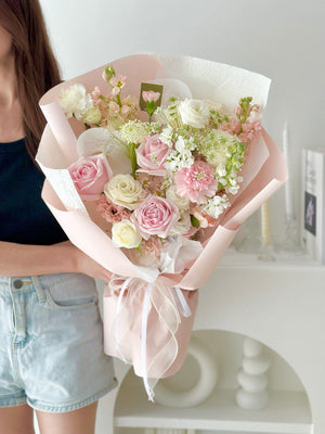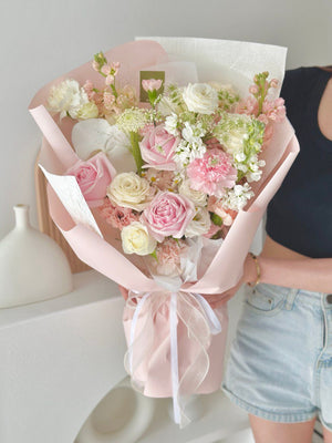 Fresh Flower: 3 x Pink Rose, 4 x Matthiola, 2 x White Rose, 1 x Phalaenopsis, 1 x Ammi Majus, 1 x Trachymene, 4 x Carnation, Pink Carnation Spray, Eustoma, Panicum, Chamomile