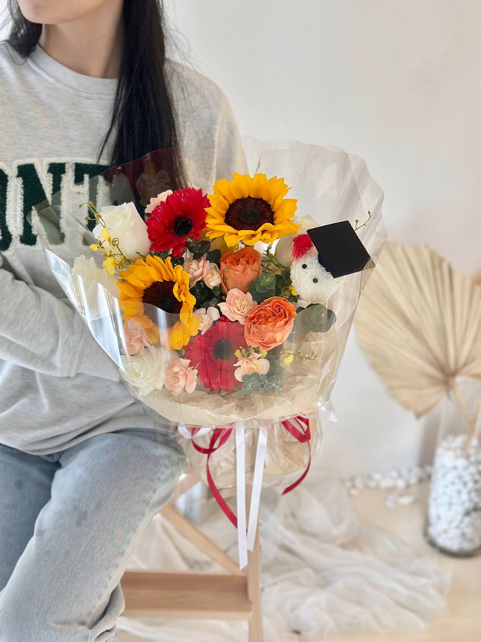 Stems Included: Sunflower, White Rose, Gerbera, Orange Rose, Dancing Lady, Ping Pong with Graduation hat, Carnation spray, Eucalyptus