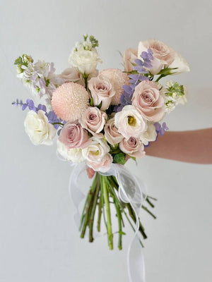Fresh Flower: 10 x Menta Rose, 2 x Ping Pong, 3 x Matthiola, Eustoma, Eucalyptus Leaf