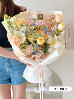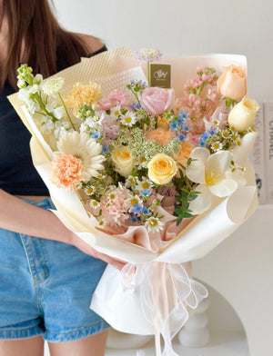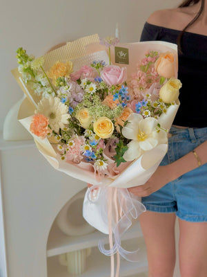 Place your flower bouquet in a cool room or shaded area. Please avoid placing your bouquet in a fridge / exposing your bouquet to direct extreme heat, ripening fruits, and direct sunlight.