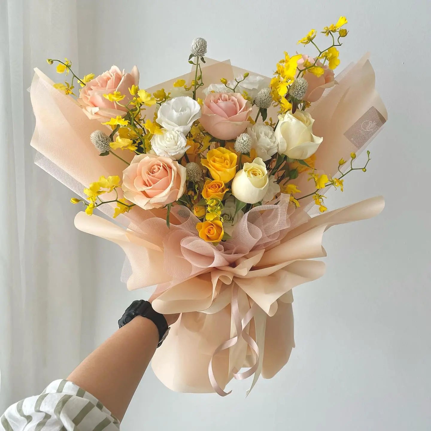 Yellow , pink and buttercup roses mixed with filler.Suitable for surprises.