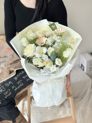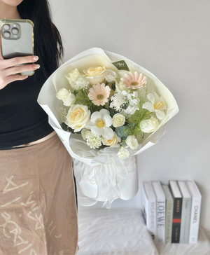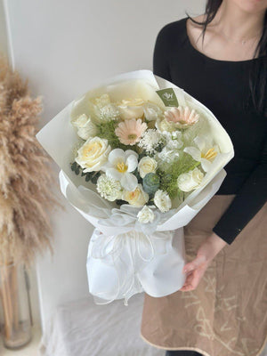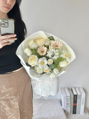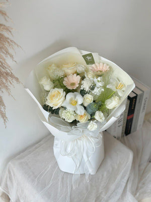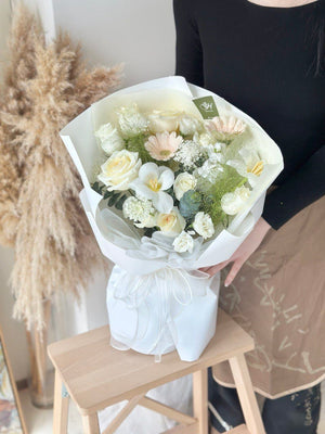 STEMS INCLUDED white Rose, Tulips, Gerbera, Panicum, Trachymene, Eucalyptus LIFESPAN 1-3 days CUSTOMIZATION We can customized your bouquet based on your budget. For customization kindly contact us through Whatsapp 011-5626-9118. COMES WITH Ð Free Message Card *All our products, including but not limited to flowers, wrappers and ribbon are subject to availability. *In the event that any of the product that you have ordered on our website or our Instagram account is not available, our experienced florist shall be at our sole absolute discretion to substitute any of the product to an alternate product of equal or higher value depending on availability from time to time. *We will ensure the style, theme and colours of your order is preserved.