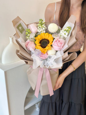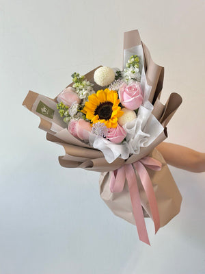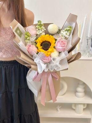 Fresh Flower: 4 x Pink Rose, 1 x Sunflower, 3 x Matthiola, 2 x Ping Pong, 3 x Trachymene
