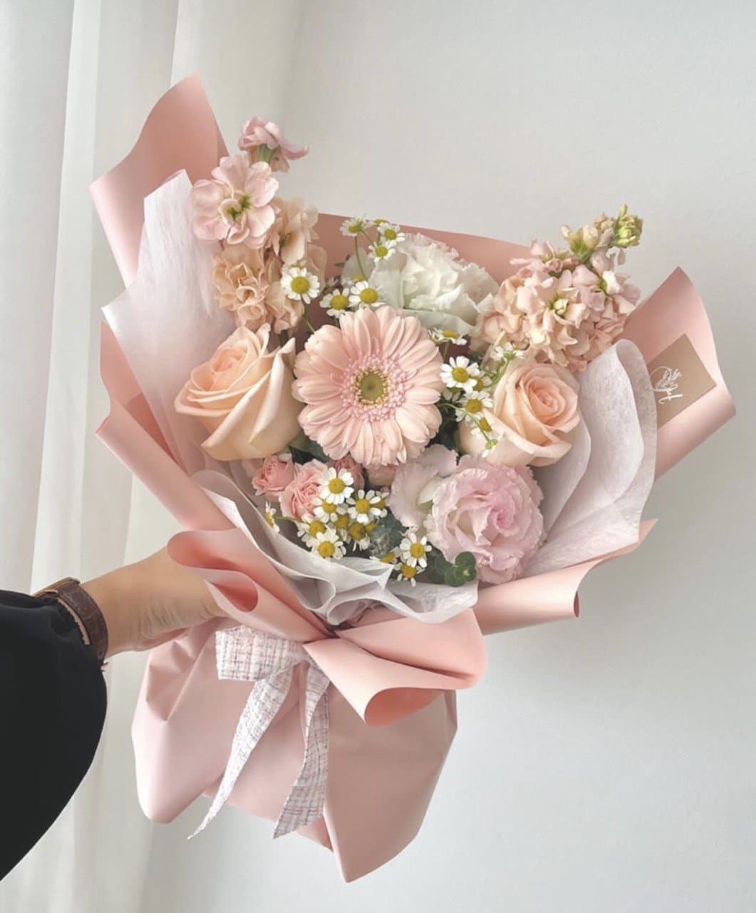 Gerbera, Champagne Rose, Chamomile, Eustoma, Matthiola