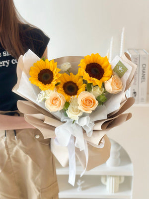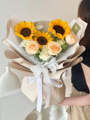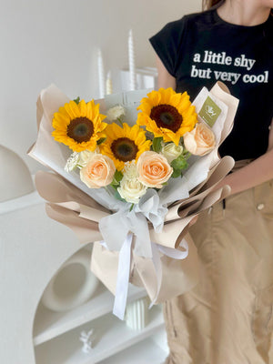 Fresh Flower: 3 x Sunflower, 3 x White Rose, 3 x Champagne Rose, 3 x Trachymene, Eucalyptus