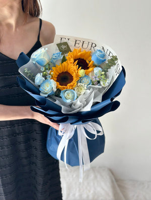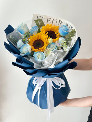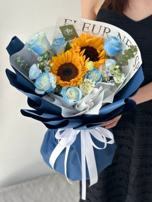 Fresh Flower: 2 x Sunflower, 7 x White rose sprayed blue, Eustoma, Oxypetalum Blue, Trachymene, Eucalyptus