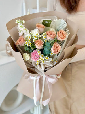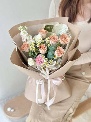 Fresh Flower: Cappuccino Rose, Pink Carnation, Eustoma, Matthiola, Chamomile, Eucalyptus