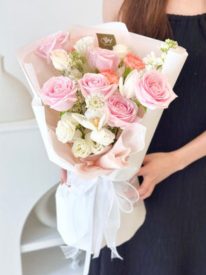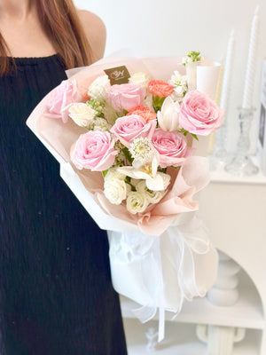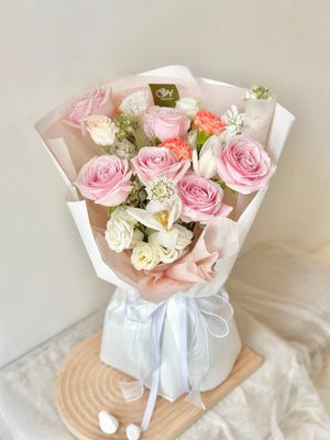 Fresh Flower: 6 x Pink Rose, 2 x Tulip, 3 x Orange Carnation, 2 x Matthiola, Panicum, Trachymene, Eustoma, Eucalyptus Leaf