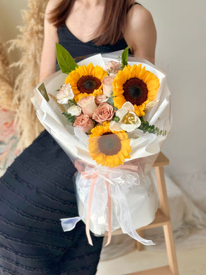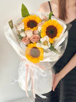 Fresh Flower: 1 x Tulip, 3 x Sunflower, 2 x Cappuccino Rose, 2 x White Rose, Eustoma, Eucalyptus