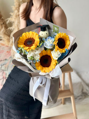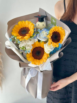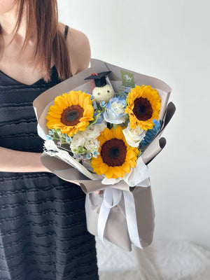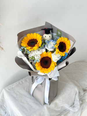 Fresh Flower: 3 x Sunflower, 3 x White Rose sprayed blue, Eustoma, Oxypetalum Blue, Ping Pong with graduation hat