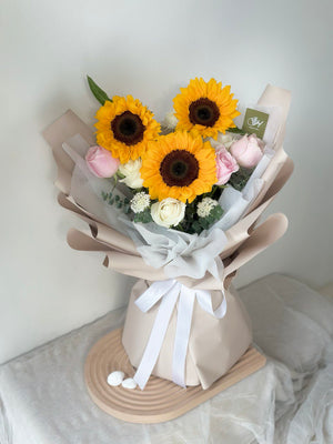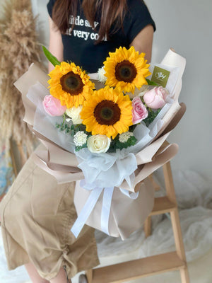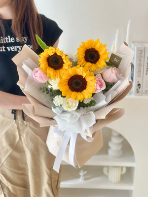 Fresh Flower: 3 x Sunflower, 3 x Pink Rose, 3 x White Rose, 3 x Trachymene, Eucalyptus