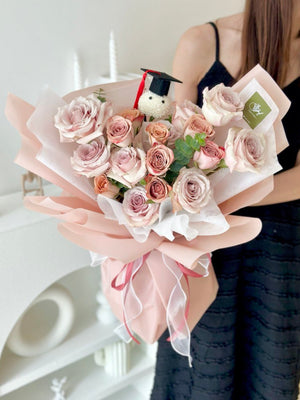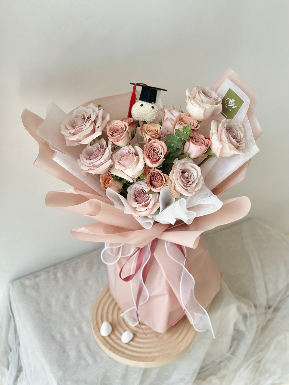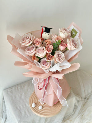 Fresh Flower: 9 x Menta Rose, 8 x Cappuccino Rose, Ping Pong with graduation hat