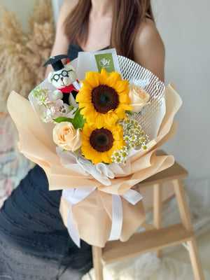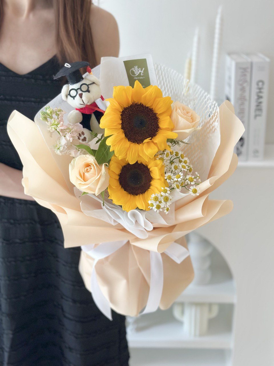 Fresh Flower: 2 x Sunflower, 2 x Champagne Rose, Chamomile, Matthiola