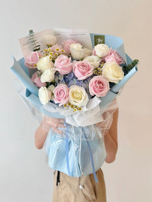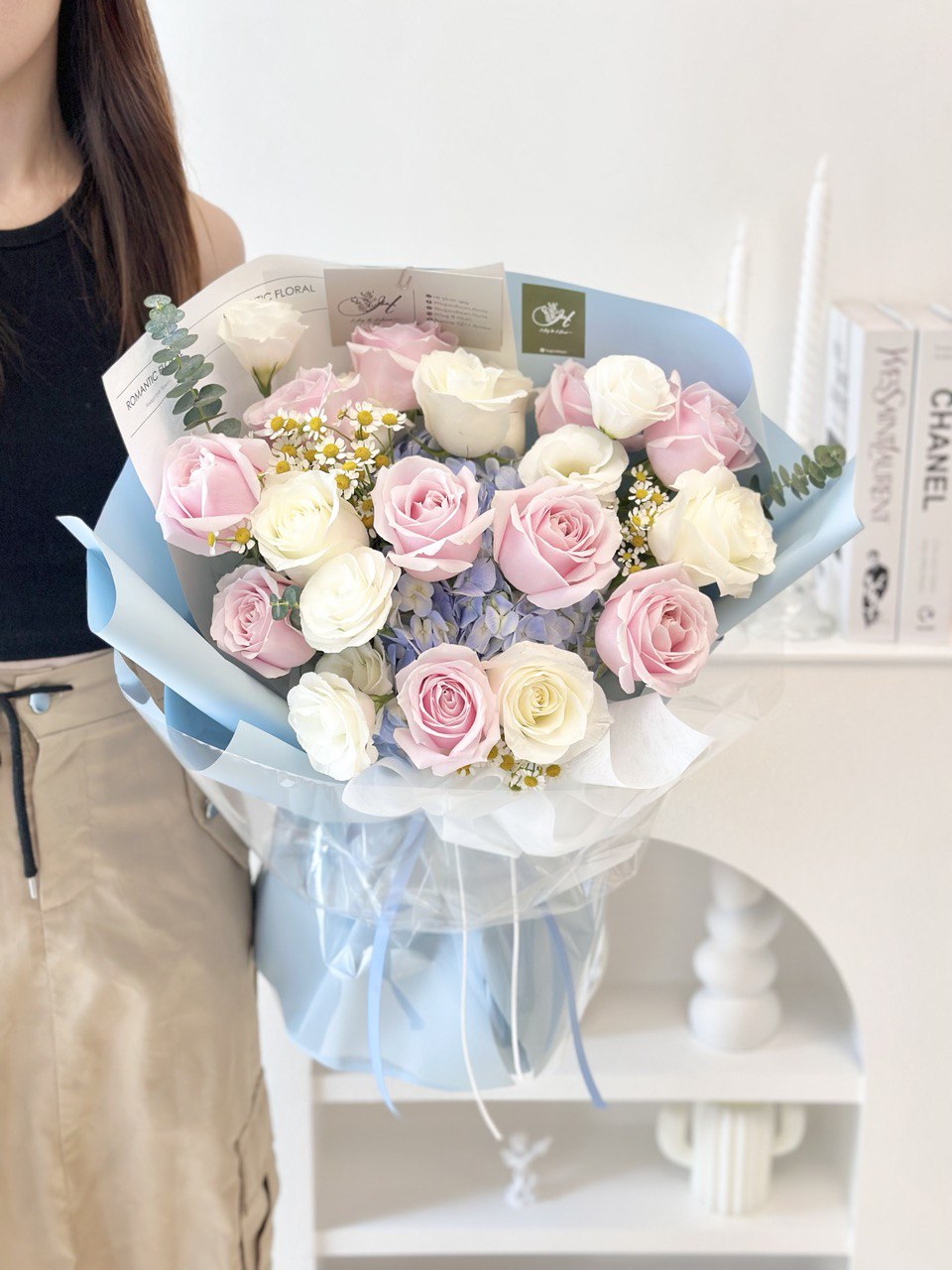 Fresh Flower: Hydrangea, 10 x Pink Rose, 5 x White Rose, Eustoma, Chamomile,