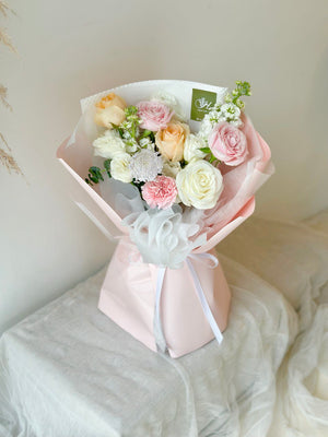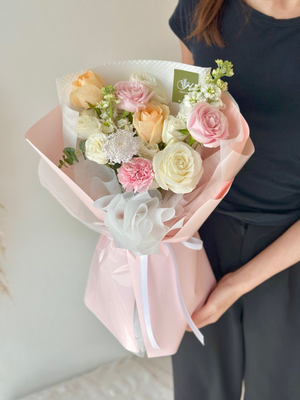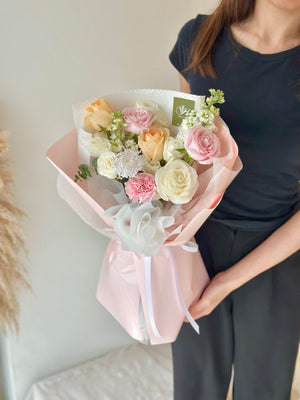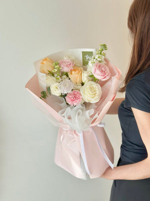 Fresh Flower: Champagne Rose, Pink rose, White Rose, Pink Carnation, Matthiola, Trachymene, Eustoma, Eucalyptus