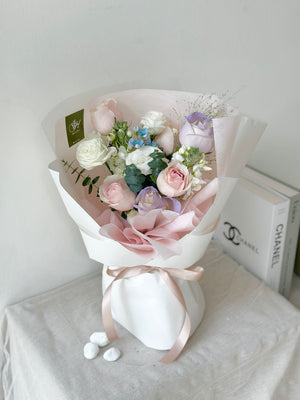 Fresh Flower: Pink Rose, White Rose, Oxypetalum Blue, Matthiola, Eustoma, Panicum, Eucalyptus
