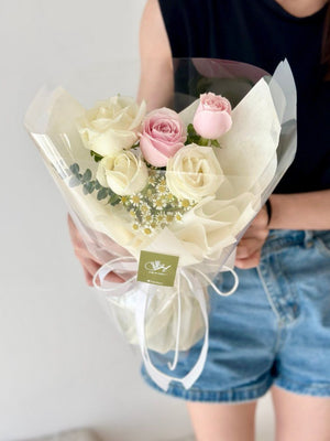 Fresh Flower: 2 x Pink Rose, 3 x White Rose, Chamomile, Eucalyptus