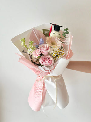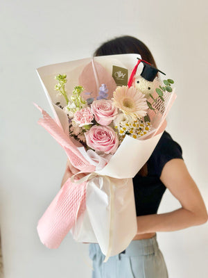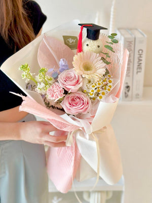 Fresh Flower: Pink Rose, Gerbera, Pink Carnation, Anthurium, Graduation Ping Pong, Matthiola, Chamomile, Eucalyptus