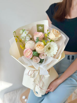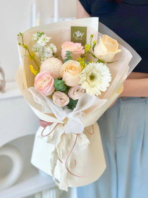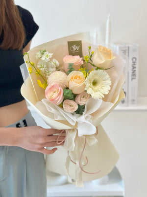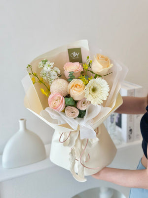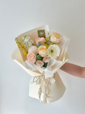 Fresh Flower: 2 x White Rose, 2 x Champagne Rose, Gerbera, Ping Pong, Dancing Lady, Matthiola, Eustoma