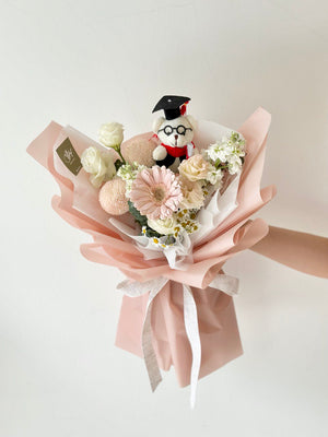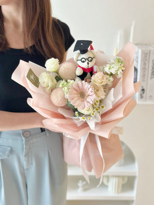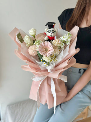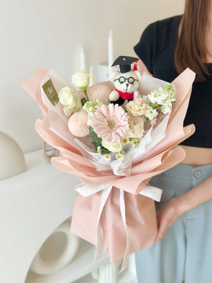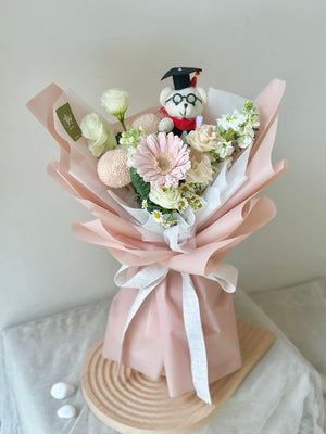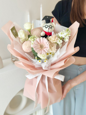 Fresh Flower: Gerbera, Ping Pong, Eustoma, Matthiola, Chamomile, Graduation Bear, Eucalyptus
