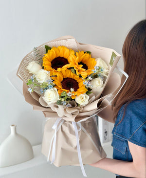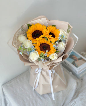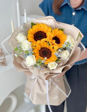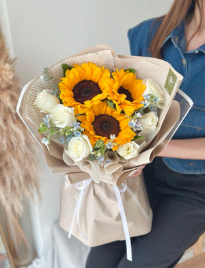 Fresh Flower:3 x Sunflower, 6 x White Rose, Oxypetalum Blue, Eucalyptus
