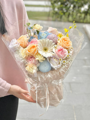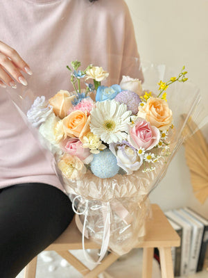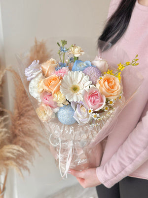 Place your flower bouquet in a cool room or shaded area. Please avoid placing your bouquet in a fridge / exposing your bouquet to direct extreme heat, ripening fruits, and direct sunlight.