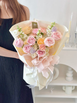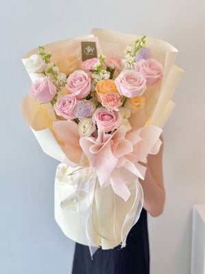 Fresh Flower: 6 x Pink Rose, 4 x Champagne Rose, 4 x Carnation, 3 x Matthiola, 2 x Trachymene, Eustoma, Eucalyptus