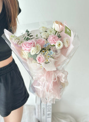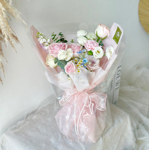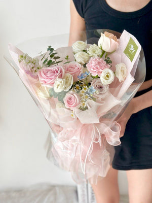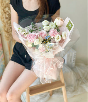 Fresh Flower: Pink Rose, White Rose, Eustoma, Carnation, Chamomile, Trachymene, Mattthiola, Oxypetalum Blue, Eucalyptus
