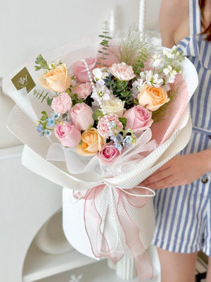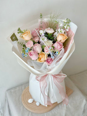 Fresh Flower: Pink Rose, Champagne Rose, White Rose, Pink Carnation, Matthiola, Panicum, Oxypetalum Blue, Eucalyptus, Pearl