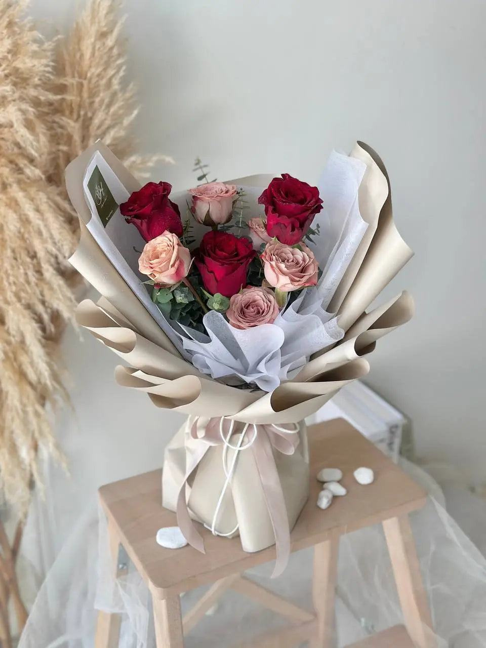 Fresh Flower: 5 x Cappuccino Rose, 3 x Red Rose, Eucalyptus Leaf