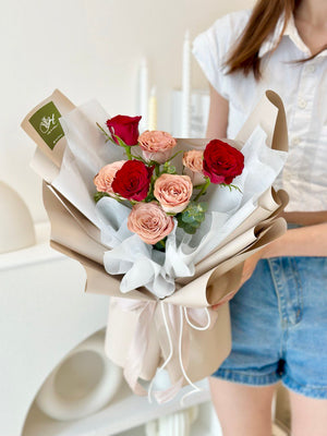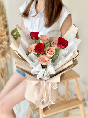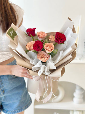 Fresh Flower: 3x Red Rose, 5 x Cappuccino Rose, Eucalyptus