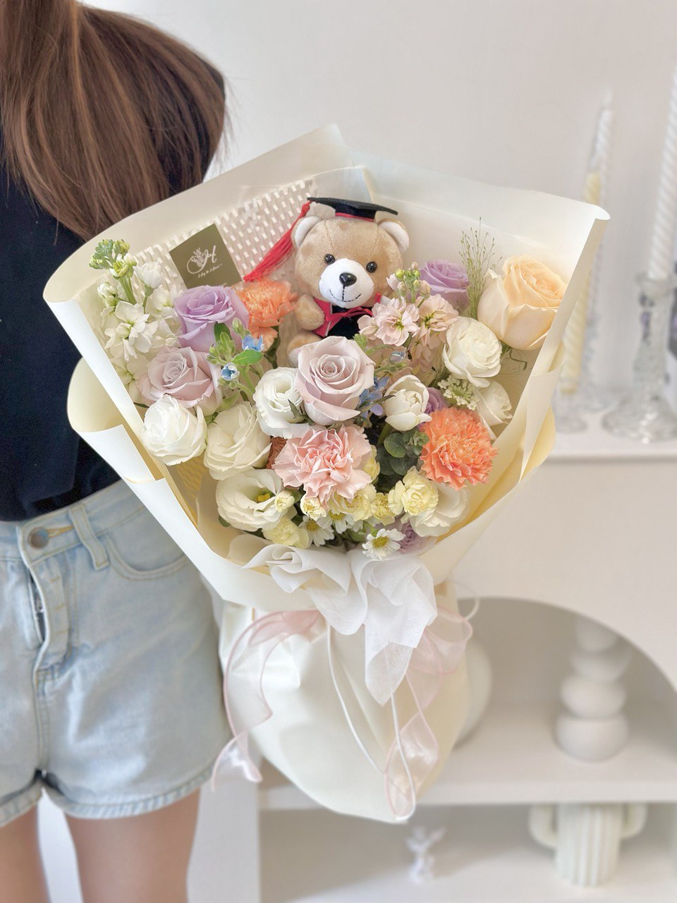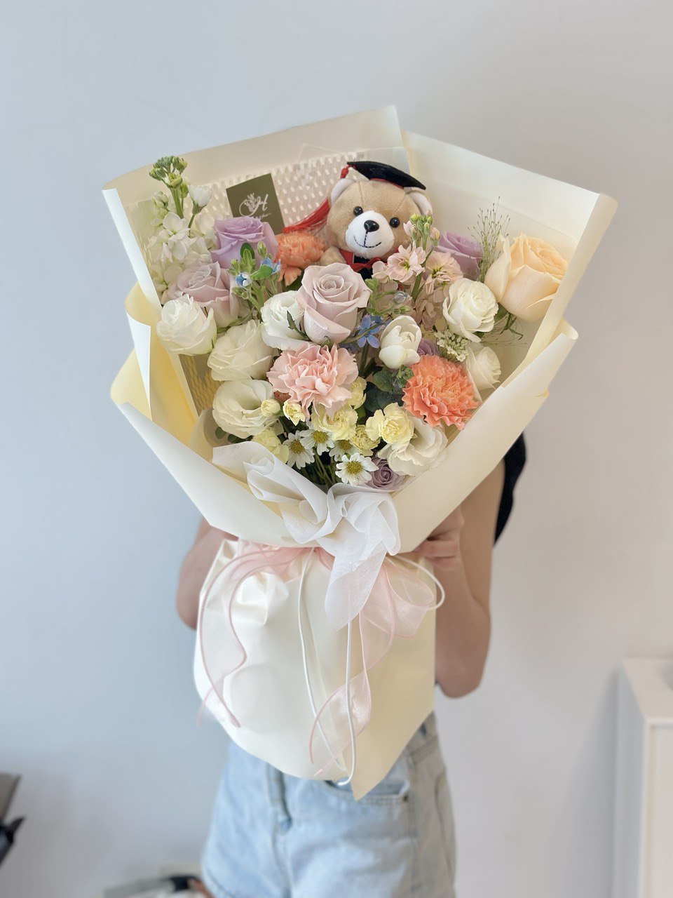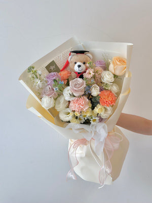 Fresh Flower: 4 x Lilac Rose, 2 x Menta Rose, 1 x Champagne Rose, 1 x Tulip, 3 x Carnation, 2 x Matthiola, 1 x Panicum, Eustoma, Oxypetalum Blue, Trachymene, Carnation Spray, Hana White, Eucalyptus Leaf, Graduation Bear