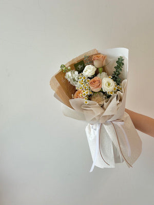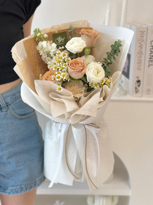Fresh Flower: 3 x Cappuccino Rose, Carnation, Matthiola, Chamomile, Eucalyptus