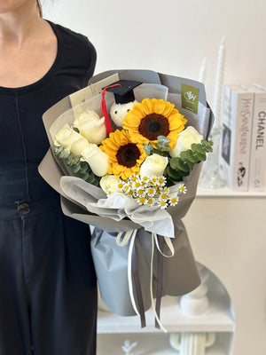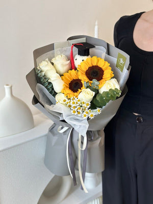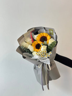 Fresh Flower: 2 x Sunflower, 6 x White Rose, Ping Pong, Chamomile, Chamomile