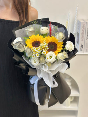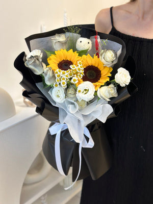 Fresh Flower: 2 x Sunflower, 7 x White Rose, 1 x Ping Pong, 1 x Panicum, Chamomile, Eustoma, Eucalyptus Leaf