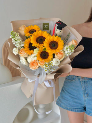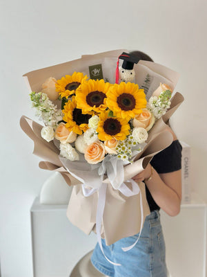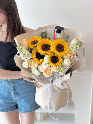 Fresh Flower: 5 x Sunflower, 6 x Champagne Rose, 2 x Matthiola, 2 x Ping Pong, Eustoma, Chamomile, Eucalyptus Leaf