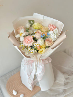 Fresh Flower: 1x Tulip, 3 x Quick Sand Rose, Hana White, Chamomile, Oxypetalum Blue, Carnation, Eustoma, Eucalyptus