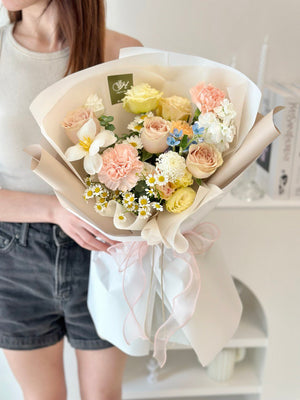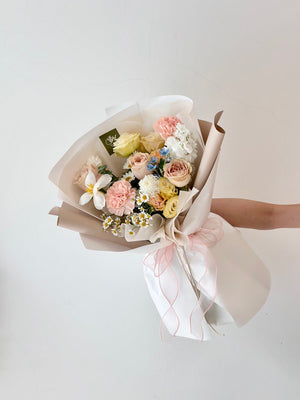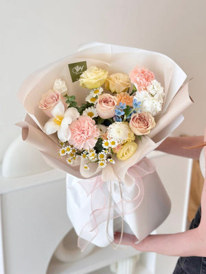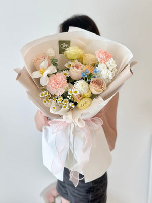 Place your flower bouquet in a cool room or shaded area. Please avoid placing your bouquet in a fridge / exposing your bouquet to direct extreme heat, ripening fruits, and direct sunlight.